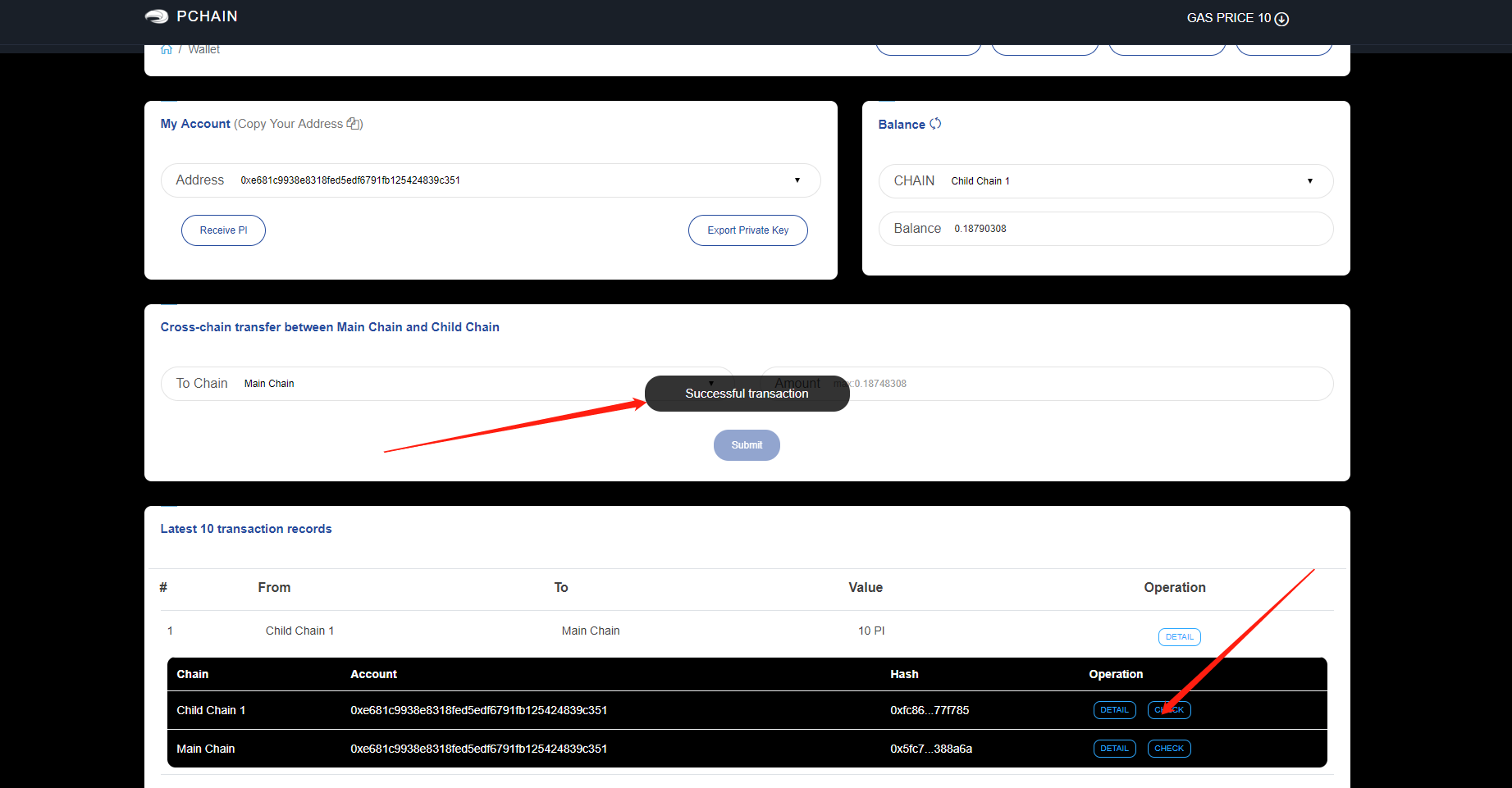 Click “Check ”, if it returns “Successful transaction” on the page, it means this transaction is successful now. You can refresh the balance on main chain again.