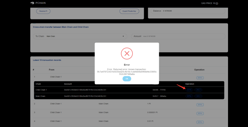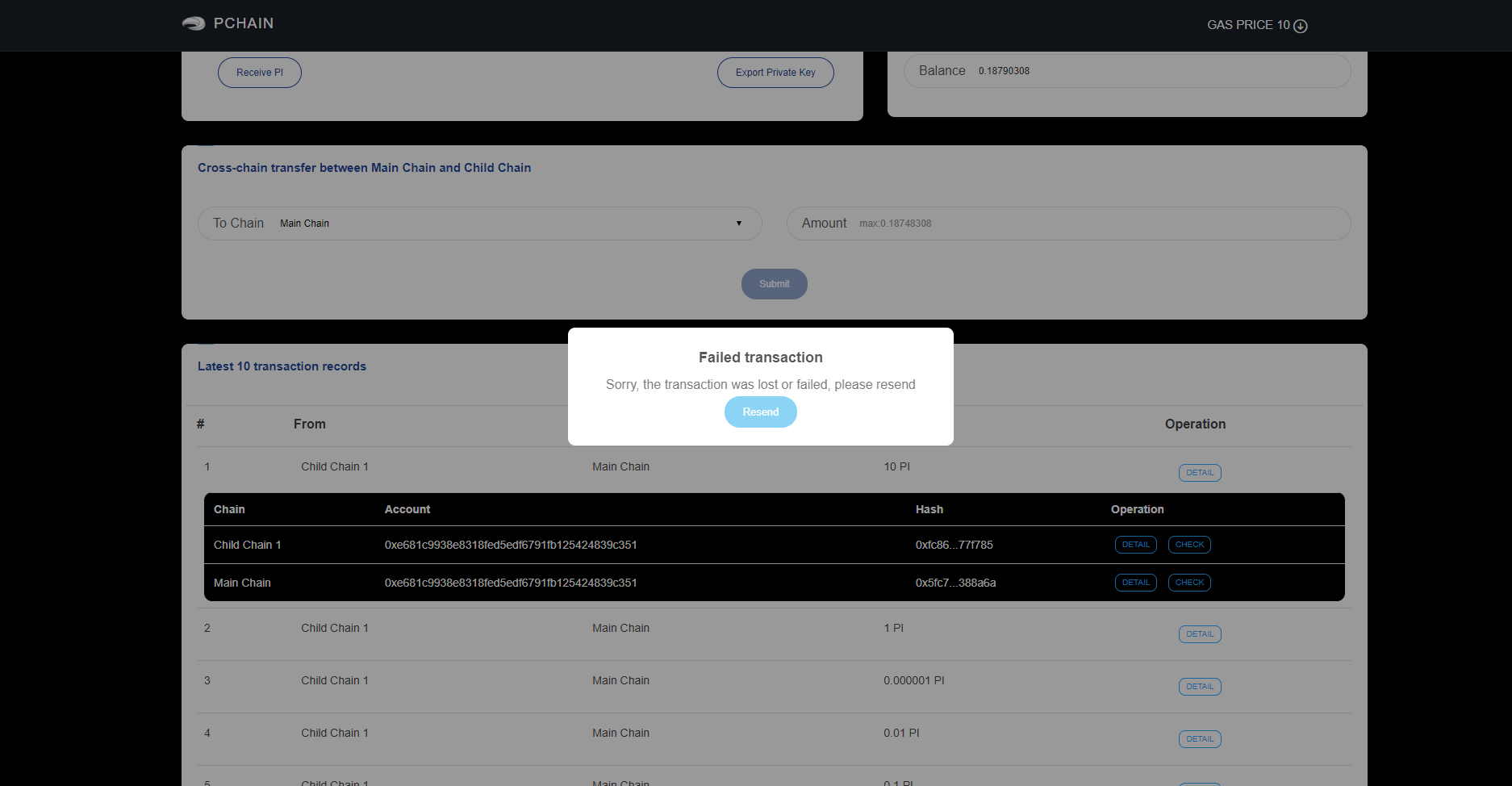 If it returns with one transaction hash, it means the resend was successful. You can check the balance within 2 minutes. If it returns “Error” like the picture below, please click “Detail” of the first transaction record and make a copy of the transaction hash. Then send this Tx hash & your address to Plian Team ( op@plian.io ). Plianteam will help you make this transaction successful in 1~2 business day(s).