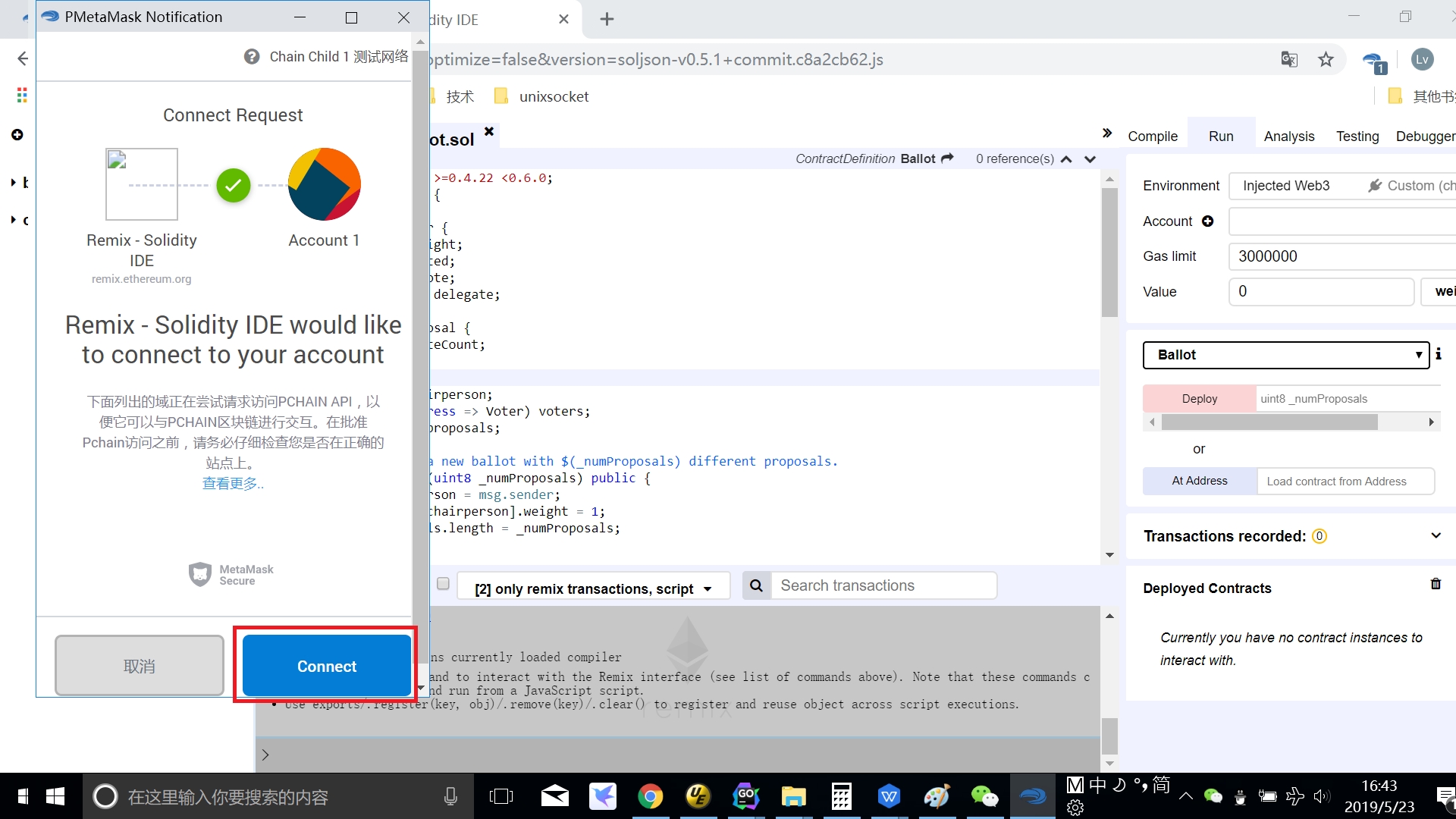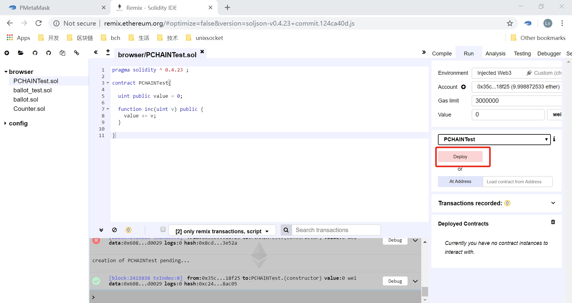 After click the ‘deploy’ button,click the ‘confirm’ button on PMetamask Notification dialog: