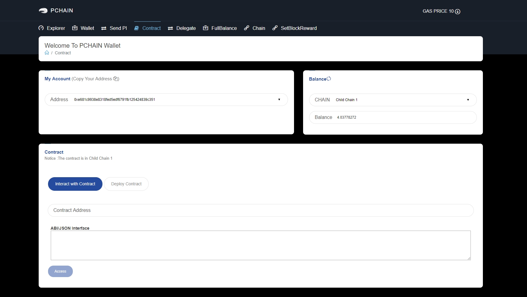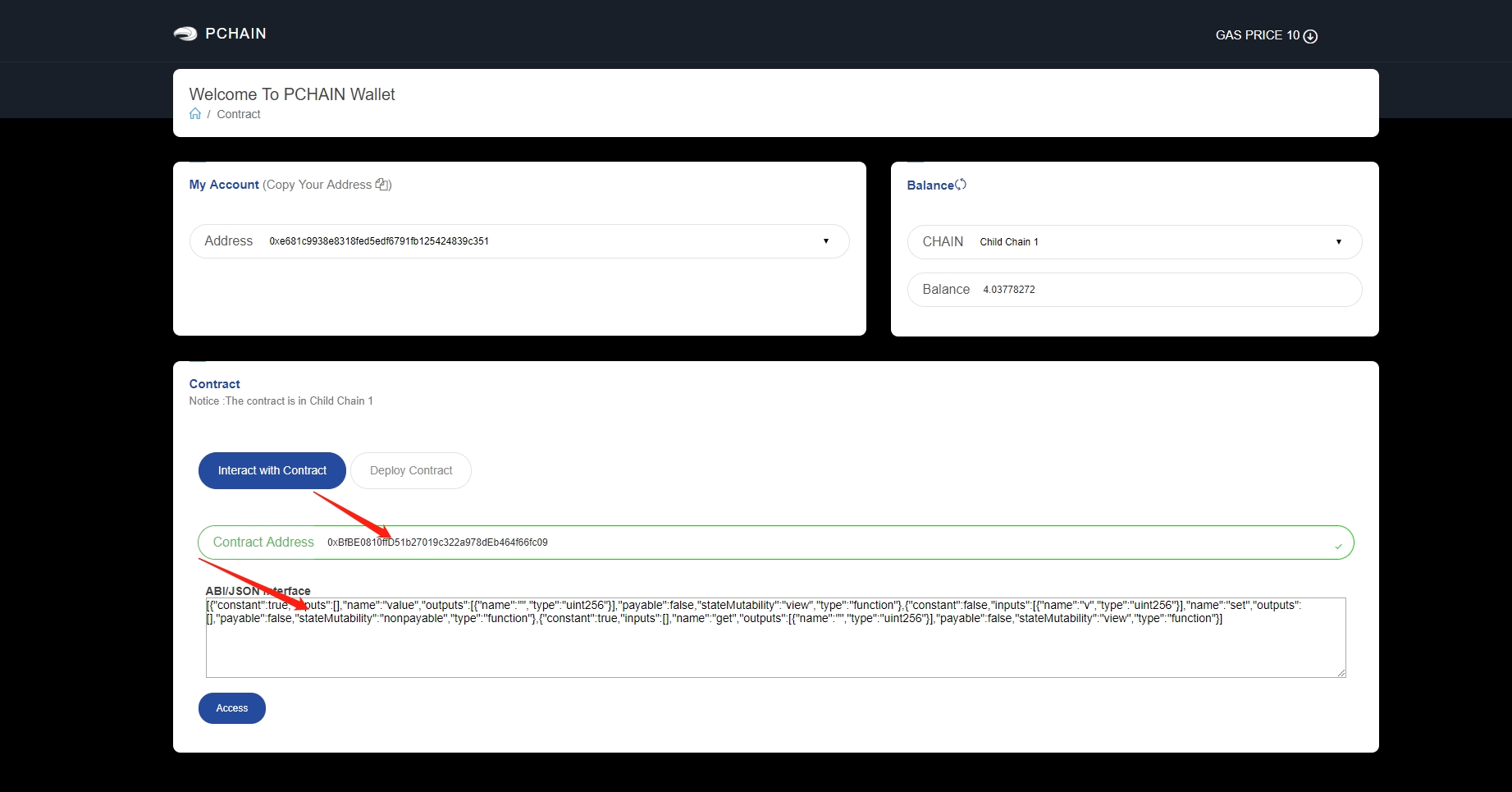 Click "Interact with Contract" button, copy your ABI/JSON Interface into it and click "Access" button.