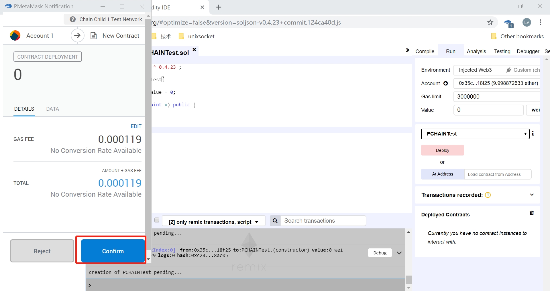 After click the ‘deploy’ button,click the ‘confirm’ button on PMetamask Notification dialog: