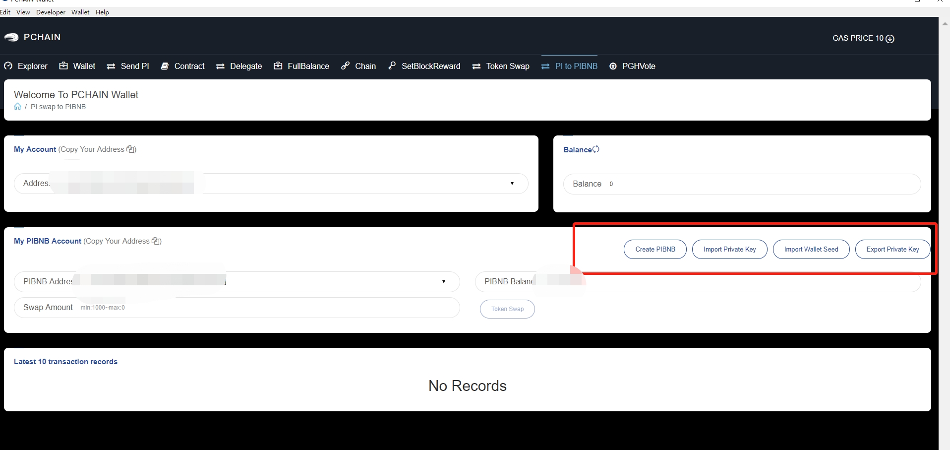 The default native PI address below is the latest one you created under the ‘Wallet’ page. If you want to create a new one, go to the ‘Wallet’ page again.