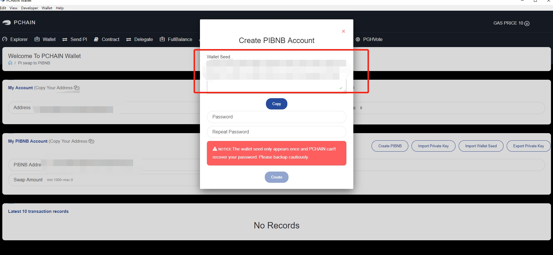 Click ‘Create PIBNB ’, copy the wallet seed (mnemonic words). Set password and repeat it. Then click ‘Create’ to confirm. Please keep the mnemonic words and password safe and for future use.