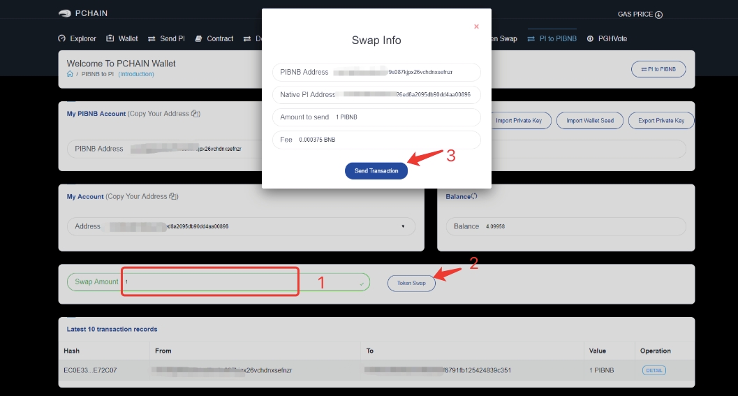 Then Click ‘Token Swap’. Enter the password of the PIBNB address and click ‘Confirm’ to continue. Please ensure there is enough BNB in your PIBNB address to cover BNB fee.