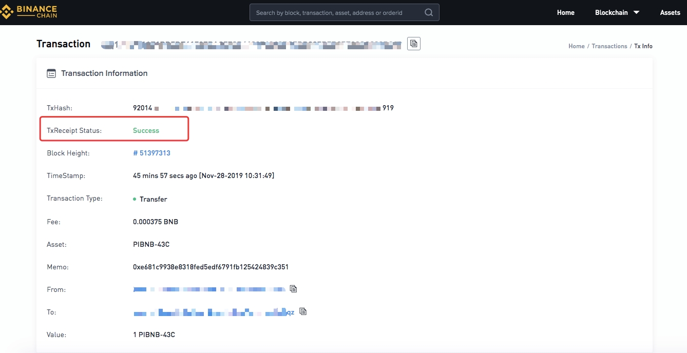 After the transaction finished, wait several mins and click the refresh icon to check your PIBNB balance.