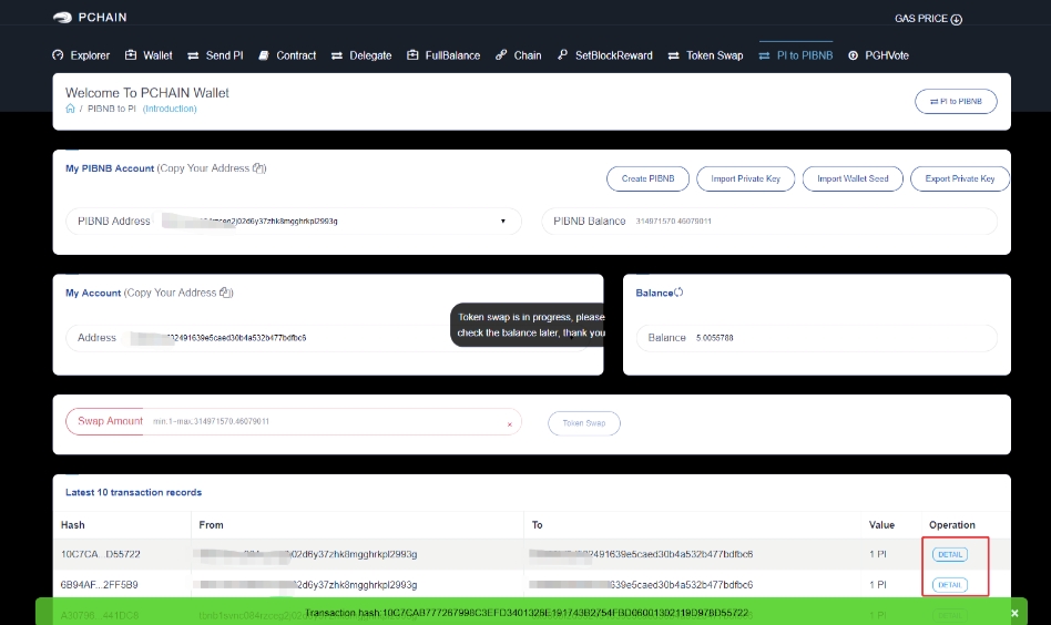 Choose your native PI address, ensure the amount is larger than 1000PI. Choose your PIBNB address, fill the amount you wanna swap, and click ‘token swap’.Notice: the amount you fill in should larger than 1000 and can’t have more than eight decimal places.